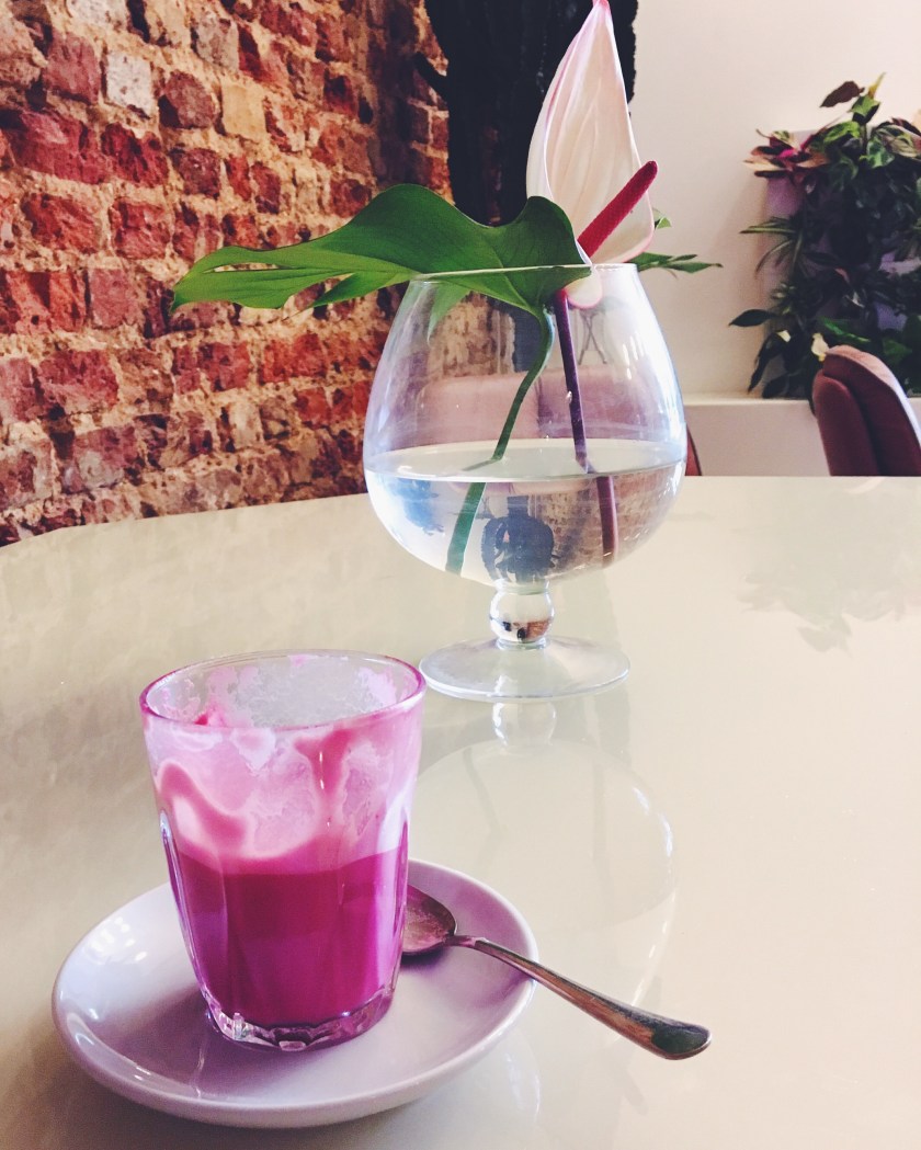 I’d been intrigued by the pink velvet latte after seeing it on Instagram but I a/ hate coffee and b/ I’m lactose intolerant, so I didn’t think I’d be able to try one. Luckily for me it was a whole new drink! Almond milk, vanilla and beetroot… And it was delicious. They also serve a variety of teas, coffees, snacks and cakes.